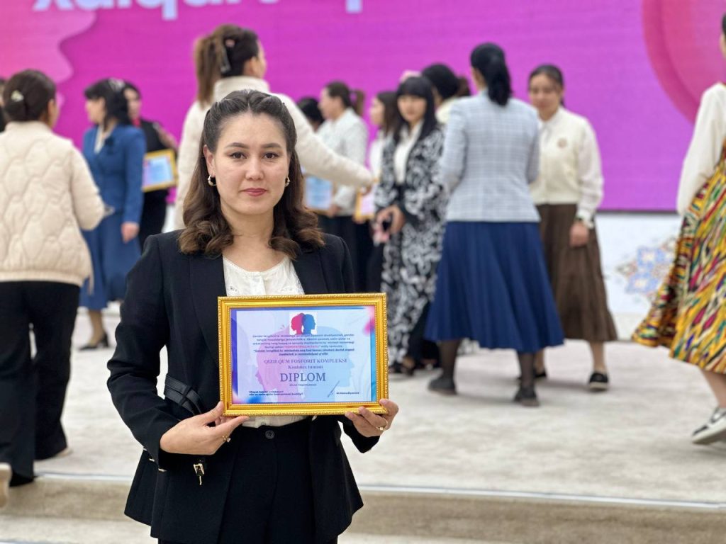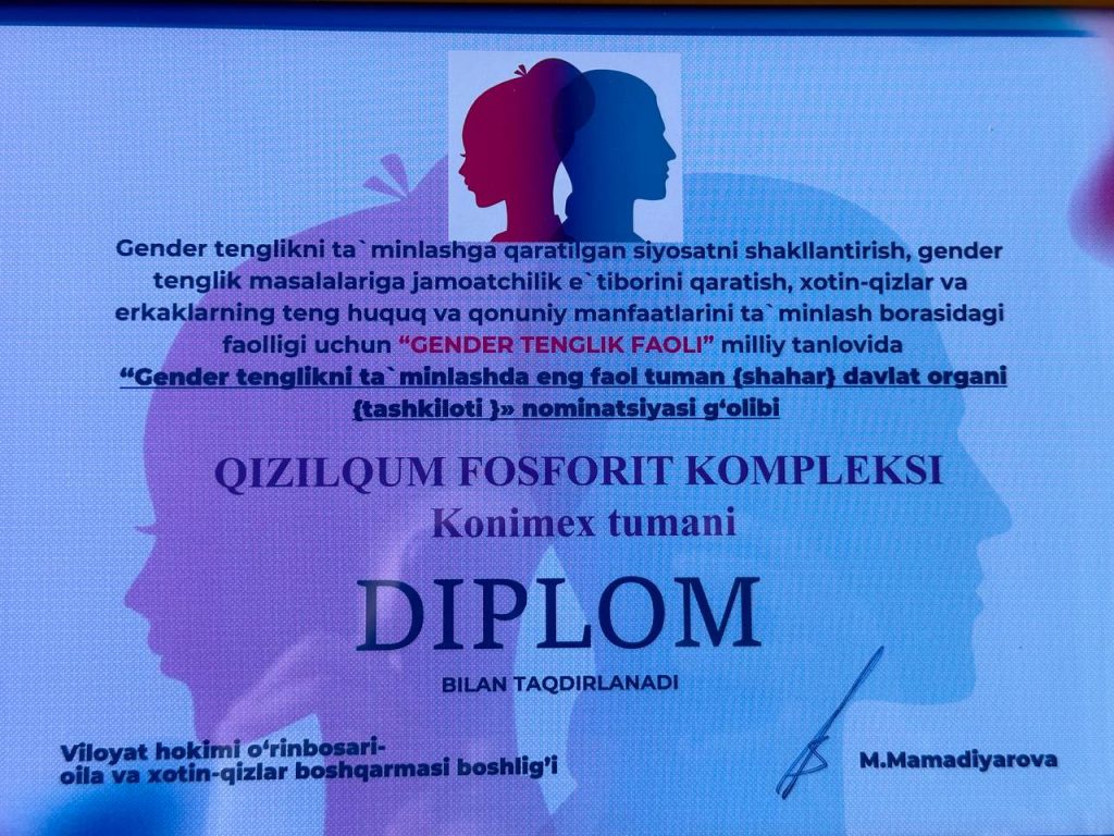 🔹 Tanlovda “Qizilqum fosforit kompleksi” MChJ “Gender tenglikni ta’minlashda eng faol tuman (shahar) davlat organi (tashkiloti)” nominatsiyasi bilan taqdirlandi.