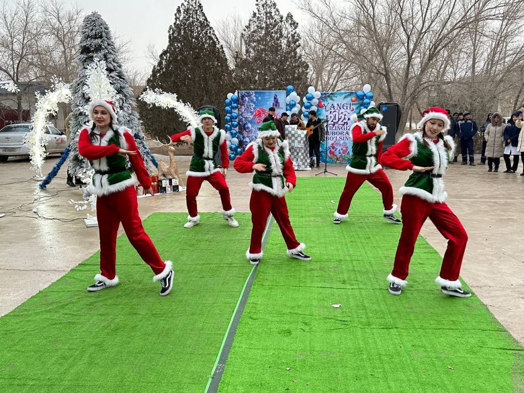 🟡 Tadbir davomida jonli ijroda yangragan qo‘shiqlar, Qorbobo va Qorqiz chiqishlari, rang-barang shou dasturlari va sahna ko’rinishlar bayramga o‘zgacha fayz bag‘ishladi. Yangi yil ramzi sifatida Yangi yil gulxani yoqilib, barcha ishtirokchilar uchun iliq va samimiy muhit yaratildi.